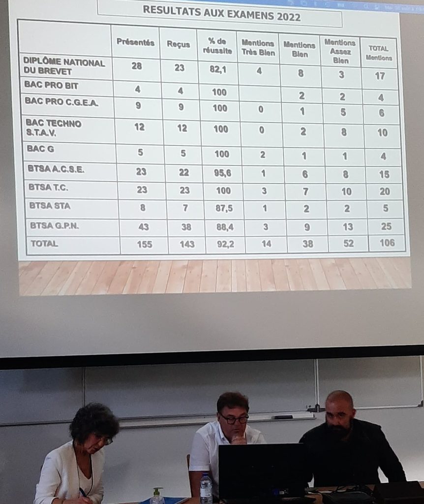 Elle a débuté par la présentation des excellents résultats aux examens avec 92,2% de réussite pour le Lycée Jean Errecart et 100% de réussite au brevet des collèges pour le collège Etchecopar.